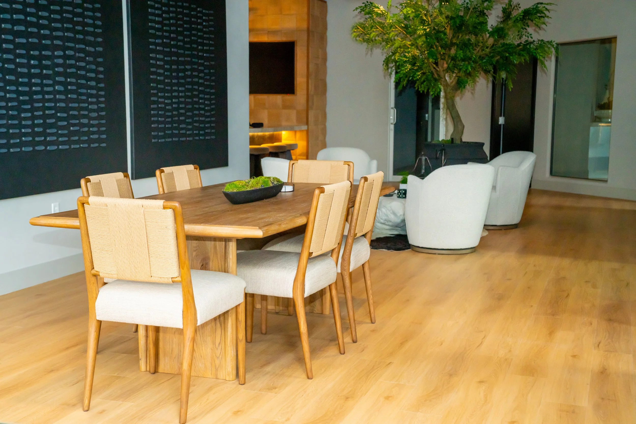 Modern dining and living room area with wooden dining table and beige chairs, white armchairs, a large wall art, and a potted tree.
